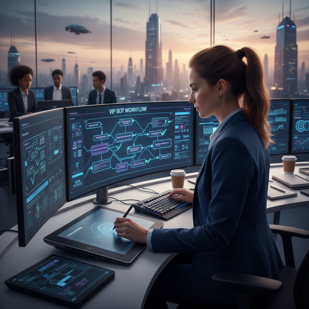 Realistyczna scena ilustrująca etapy pracy bota VIP – człowiek i technologia, krok po kroku.